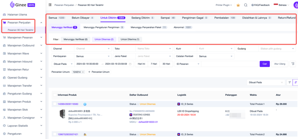 2. Status Bar Pesanan: Lunas, Telah Diverifikasi, Atur Pengiriman, Pesan Pesanan/Push Gudang, Menunggu Pickup